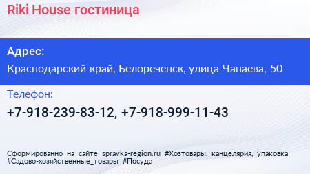 Riki House, гостиница по адресу Краснодарский край, Белореченск, улица Чапаева, 50 в дальнейшем Организация, размещена в следующих категориях: