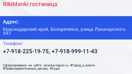 RikiManki, гостиница по адресу Краснодарский край, Белореченск, улица Луначарского, 147 в дальнейшем Организация, размещена в следующих категориях:
