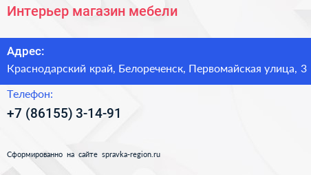 Интерьер, магазин мебели по адресу Краснодарский край, Белореченск, Первомайская улица, 3 в дальнейшем Организация, размещена в следующих категориях: