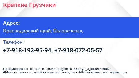 Крепкие Грузчики по адресу Краснодарский край, Белореченск, в дальнейшем Организация, размещена в следующих категориях: