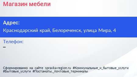 Магазин мебели по адресу Краснодарский край, Белореченск, улица Мира, 4 в дальнейшем Организация, размещена в следующих категориях: