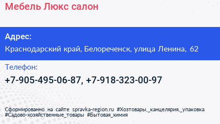 Мебель Люкс, салон по адресу Краснодарский край, Белореченск, улица Ленина, 62 в дальнейшем Организация, размещена в следующих категориях: