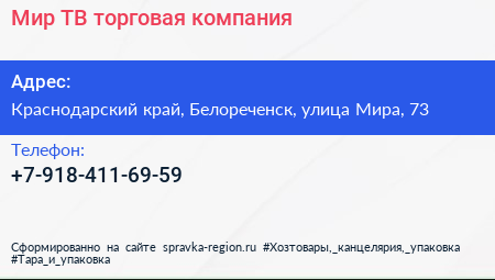 Мир-ТВ, торговая компания по адресу Краснодарский край, Белореченск, улица Мира, 73 в дальнейшем Организация, размещена в следующих категориях: