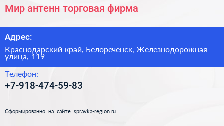 Мир-антенн, торговая фирма по адресу Краснодарский край, Белореченск, Железнодорожная улица, 119 в дальнейшем Организация, размещена в следующих категориях: