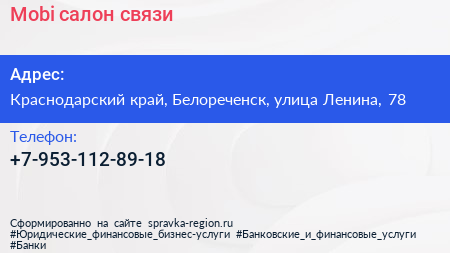 Mobi, салон связи по адресу Краснодарский край, Белореченск, улица Ленина, 78 в дальнейшем Организация, размещена в следующих категориях: