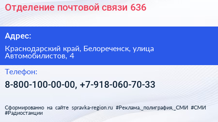 Отделение почтовой связи №636 по адресу Краснодарский край, Белореченск, улица Автомобилистов, 4 в дальнейшем Организация, размещена в следующих категориях: