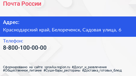 Почта России по адресу Краснодарский край, Белореченск, Садовая улица, 6 в дальнейшем Организация, размещена в следующих категориях: