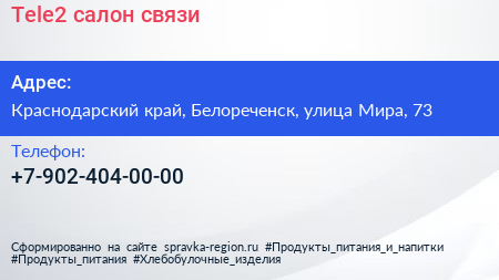 Tele2, салон связи по адресу Краснодарский край, Белореченск, улица Мира, 73 в дальнейшем Организация, размещена в следующих категориях: