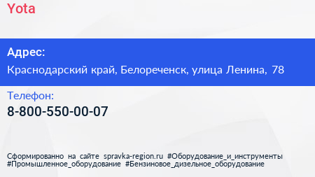 Yota по адресу Краснодарский край, Белореченск, улица Ленина, 78 в дальнейшем Организация, размещена в следующих категориях: