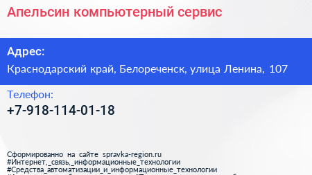 Апельсин, компьютерный сервис по адресу Краснодарский край, Белореченск, улица Ленина, 107 в дальнейшем Организация, размещена в следующих категориях: