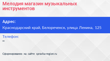 Мелодия, магазин музыкальных инструментов по адресу Краснодарский край, Белореченск, улица Ленина, 125 в дальнейшем Организация, размещена в следующих категориях: