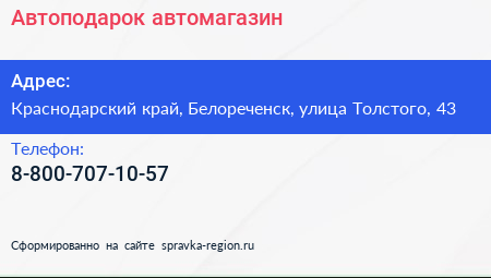 Автоподарок, автомагазин по адресу Краснодарский край, Белореченск, улица Толстого, 43 в дальнейшем Организация, размещена в следующих категориях: