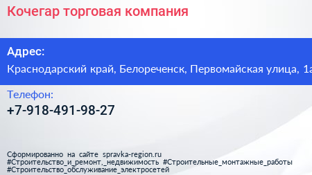 Кочегар, торговая компания по адресу Краснодарский край, Белореченск, Первомайская улица, 1а в дальнейшем Организация, размещена в следующих категориях: