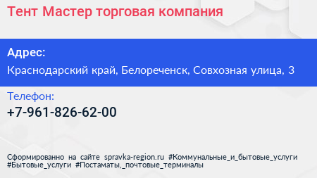 Тент Мастер, торговая компания по адресу Краснодарский край, Белореченск, Совхозная улица, 3 в дальнейшем Организация, размещена в следующих категориях: