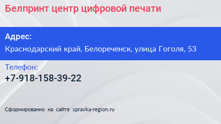 Белпринт, центр цифровой печати по адресу Краснодарский край, Белореченск, улица Гоголя, 53 в дальнейшем Организация, размещена в следующих категориях: