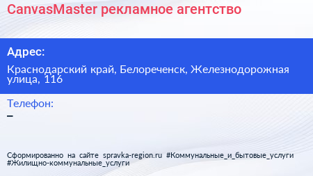 CanvasMaster, рекламное агентство по адресу Краснодарский край, Белореченск, Железнодорожная улица, 116 в дальнейшем Организация, размещена в следующих категориях: