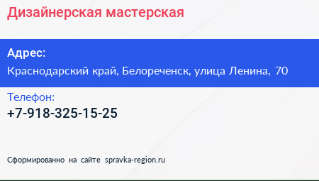 Дизайнерская мастерская по адресу Краснодарский край, Белореченск, улица Ленина, 70 в дальнейшем Организация, размещена в следующих категориях: