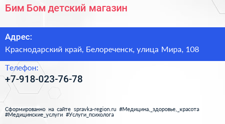 Бим-Бом, детский магазин по адресу Краснодарский край, Белореченск, улица Мира, 108 в дальнейшем Организация, размещена в следующих категориях: