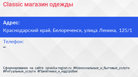 Classic, магазин одежды по адресу Краснодарский край, Белореченск, улица Ленина, 125/1 в дальнейшем Организация, размещена в следующих категориях: