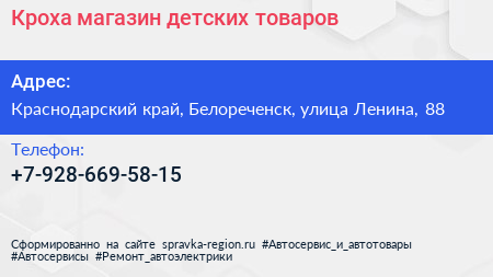 Кроха, магазин детских товаров по адресу Краснодарский край, Белореченск, улица Ленина, 88 в дальнейшем Организация, размещена в следующих категориях: