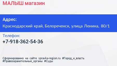 МАЛЫШ, магазин по адресу Краснодарский край, Белореченск, улица Ленина, 80/1 в дальнейшем Организация, размещена в следующих категориях: