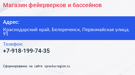 Магазин фейерверков и бассейнов по адресу Краснодарский край, Белореченск, Первомайская улица, 91 в дальнейшем Организация, размещена в следующих категориях: