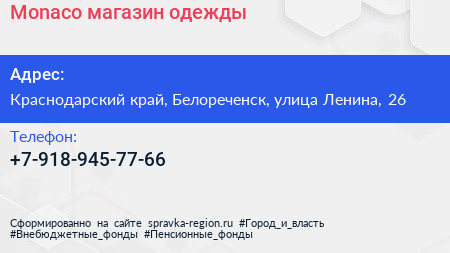 Monaco, магазин одежды по адресу Краснодарский край, Белореченск, улица Ленина, 26 в дальнейшем Организация, размещена в следующих категориях: