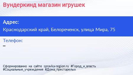 Вундеркинд, магазин игрушек по адресу Краснодарский край, Белореченск, улица Мира, 75 в дальнейшем Организация, размещена в следующих категориях:
