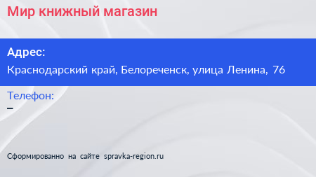Мир, книжный магазин по адресу Краснодарский край, Белореченск, улица Ленина, 76 в дальнейшем Организация, размещена в следующих категориях: