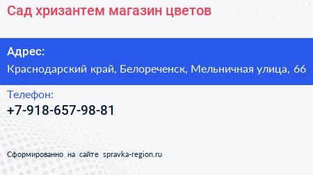 Сад хризантем, магазин цветов по адресу Краснодарский край, Белореченск, Мельничная улица, 66 в дальнейшем Организация, размещена в следующих категориях:
