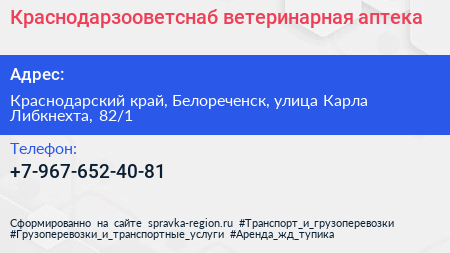 Краснодарзооветснаб, ветеринарная аптека по адресу Краснодарский край, Белореченск, улица Карла Либкнехта, 82/1 в дальнейшем Организация, размещена в следующих категориях: