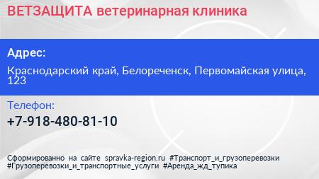 ВЕТЗАЩИТА, ветеринарная клиника по адресу Краснодарский край, Белореченск, Первомайская улица, 123 в дальнейшем Организация, размещена в следующих категориях: