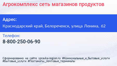 Агрокомплекс, сеть магазинов продуктов по адресу Краснодарский край, Белореченск, улица Ленина, 62 в дальнейшем Организация, размещена в следующих категориях: