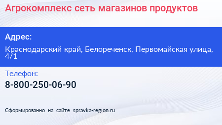 Агрокомплекс, сеть магазинов продуктов по адресу Краснодарский край, Белореченск, Первомайская улица, 4/1 в дальнейшем Организация, размещена в следующих категориях: