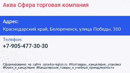 Аква Сфера, торговая компания по адресу Краснодарский край, Белореченск, улица Победы, 310 в дальнейшем Организация, размещена в следующих категориях: