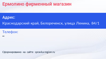 Ермолино, фирменный магазин по адресу Краснодарский край, Белореченск, улица Ленина, 84/1 в дальнейшем Организация, размещена в следующих категориях: