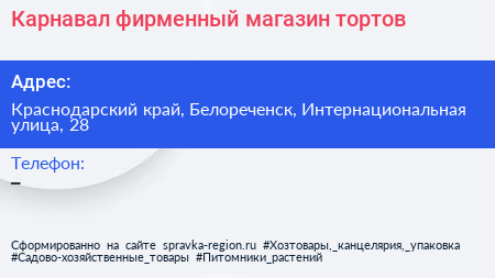 Карнавал, фирменный магазин тортов по адресу Краснодарский край, Белореченск, Интернациональная улица, 28 в дальнейшем Организация, размещена в следующих категориях:
