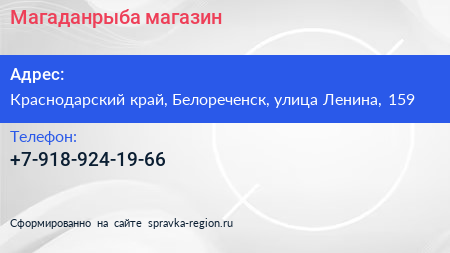 Магаданрыба, магазин по адресу Краснодарский край, Белореченск, улица Ленина, 159 в дальнейшем Организация, размещена в следующих категориях: