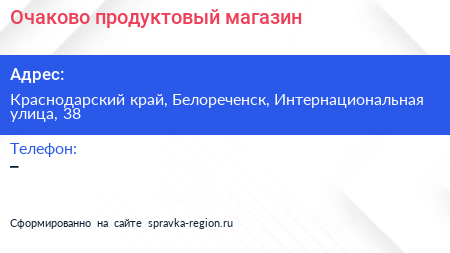 Очаково, продуктовый магазин по адресу Краснодарский край, Белореченск, Интернациональная улица, 38 в дальнейшем Организация, размещена в следующих категориях: