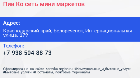 Пив & Ко, сеть мини-маркетов по адресу Краснодарский край, Белореченск, Интернациональная улица, 179 в дальнейшем Организация, размещена в следующих категориях: