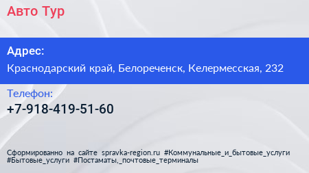 Авто-Тур по адресу Краснодарский край, Белореченск, Келермесская, 232 в дальнейшем Организация, размещена в следующих категориях: