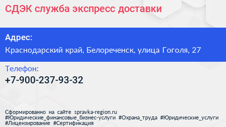 СДЭК, служба экспресс-доставки по адресу Краснодарский край, Белореченск, улица Гоголя, 27 в дальнейшем Организация, размещена в следующих категориях: