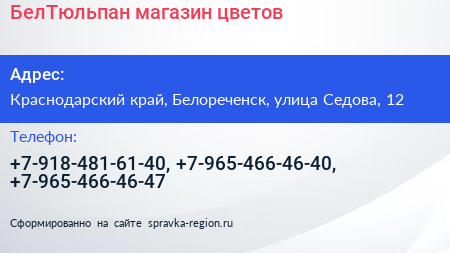 БелТюльпан, магазин цветов по адресу Краснодарский край, Белореченск, улица Седова, 12 в дальнейшем Организация, размещена в следующих категориях: