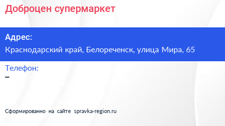 Доброцен, супермаркет по адресу Краснодарский край, Белореченск, улица Мира, 65 в дальнейшем Организация, размещена в следующих категориях: