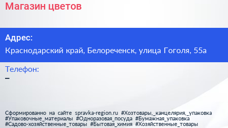 Магазин цветов по адресу Краснодарский край, Белореченск, улица Гоголя, 55а в дальнейшем Организация, размещена в следующих категориях:
