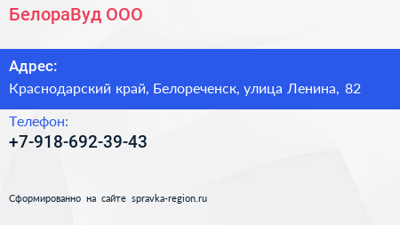 БелораВуд, ООО по адресу Краснодарский край, Белореченск, улица Ленина, 82 в дальнейшем Организация, размещена в следующих категориях: