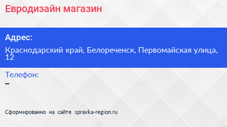 Евродизайн, магазин по адресу Краснодарский край, Белореченск, Первомайская улица, 12 в дальнейшем Организация, размещена в следующих категориях:
