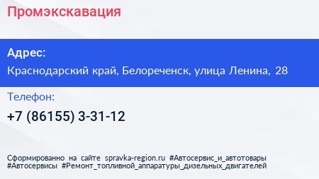 Промэкскавация по адресу Краснодарский край, Белореченск, улица Ленина, 28 в дальнейшем Организация, размещена в следующих категориях: