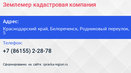 Землемер, кадастровая компания по адресу Краснодарский край, Белореченск, Родниковый переулок, 5 в дальнейшем Организация, размещена в следующих категориях: