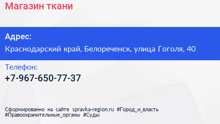 Магазин ткани по адресу Краснодарский край, Белореченск, улица Гоголя, 40 в дальнейшем Организация, размещена в следующих категориях: